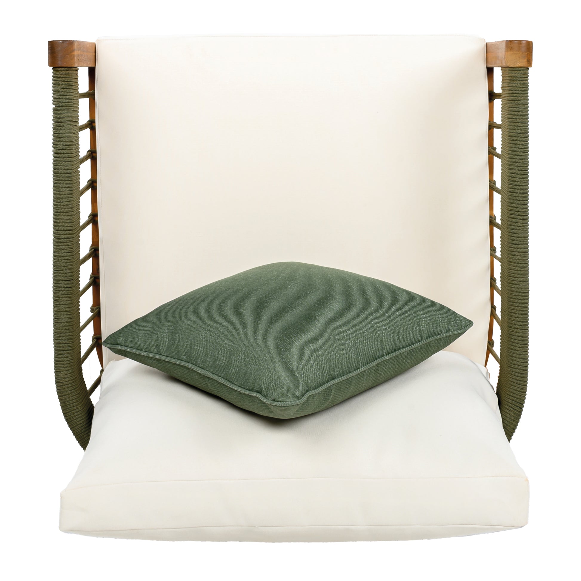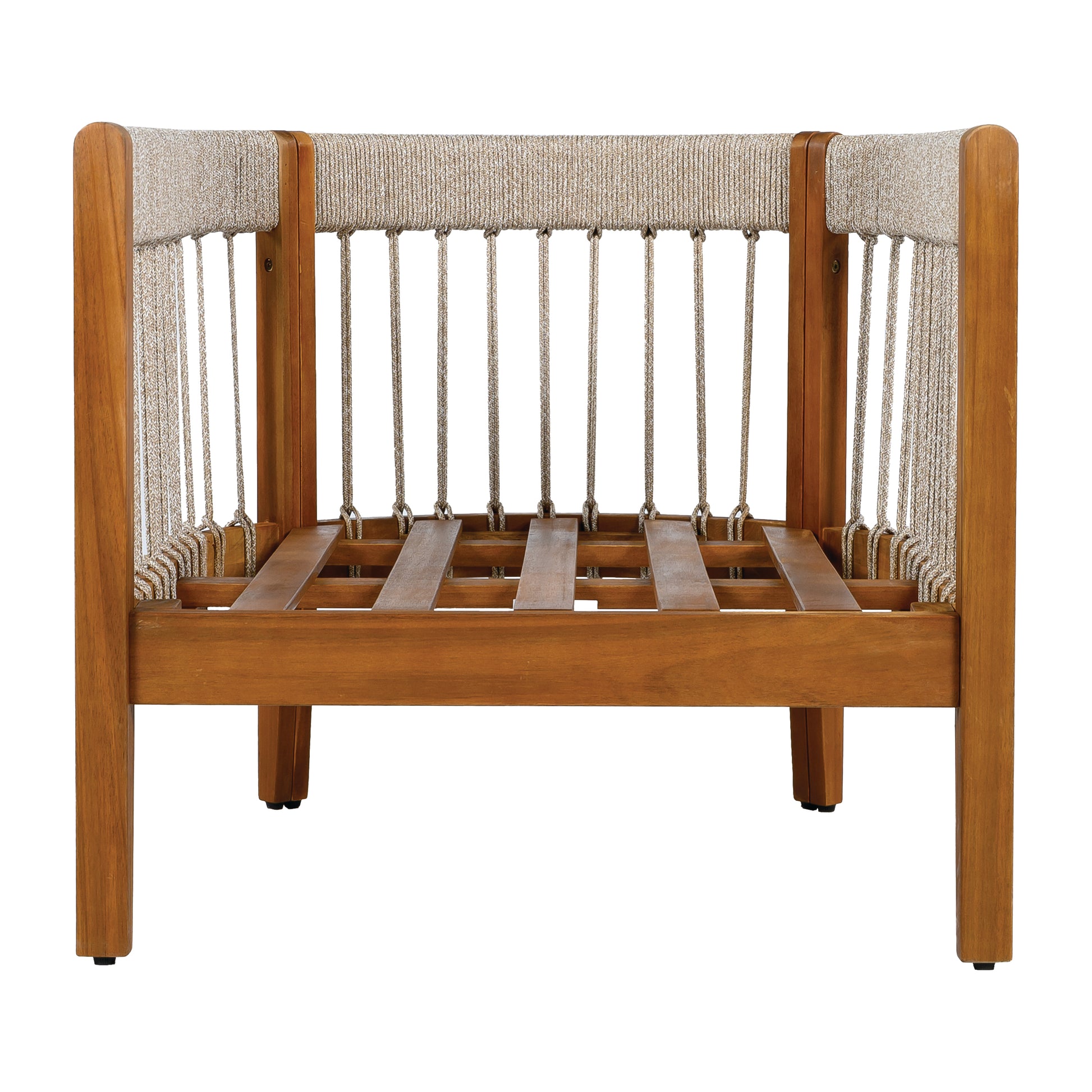 Handwoven Rope Detailing: Natural fiber ropes are hand-woven along the armrests and seat frame by skilled craftspeople, adding artisanal character to the clean wood surfaces. The durable rope detailing is securely fas...