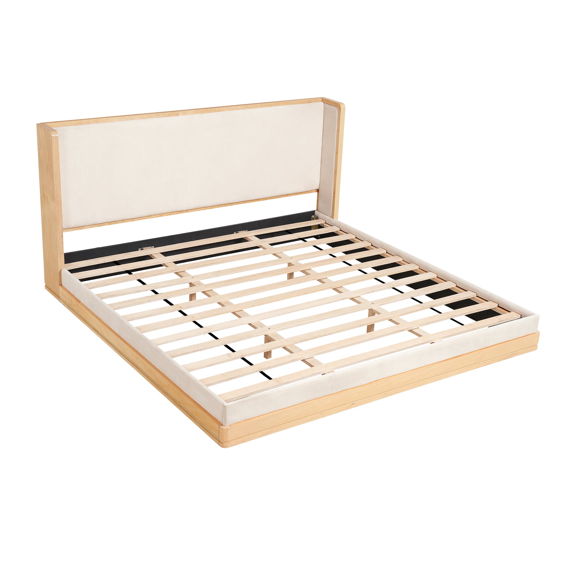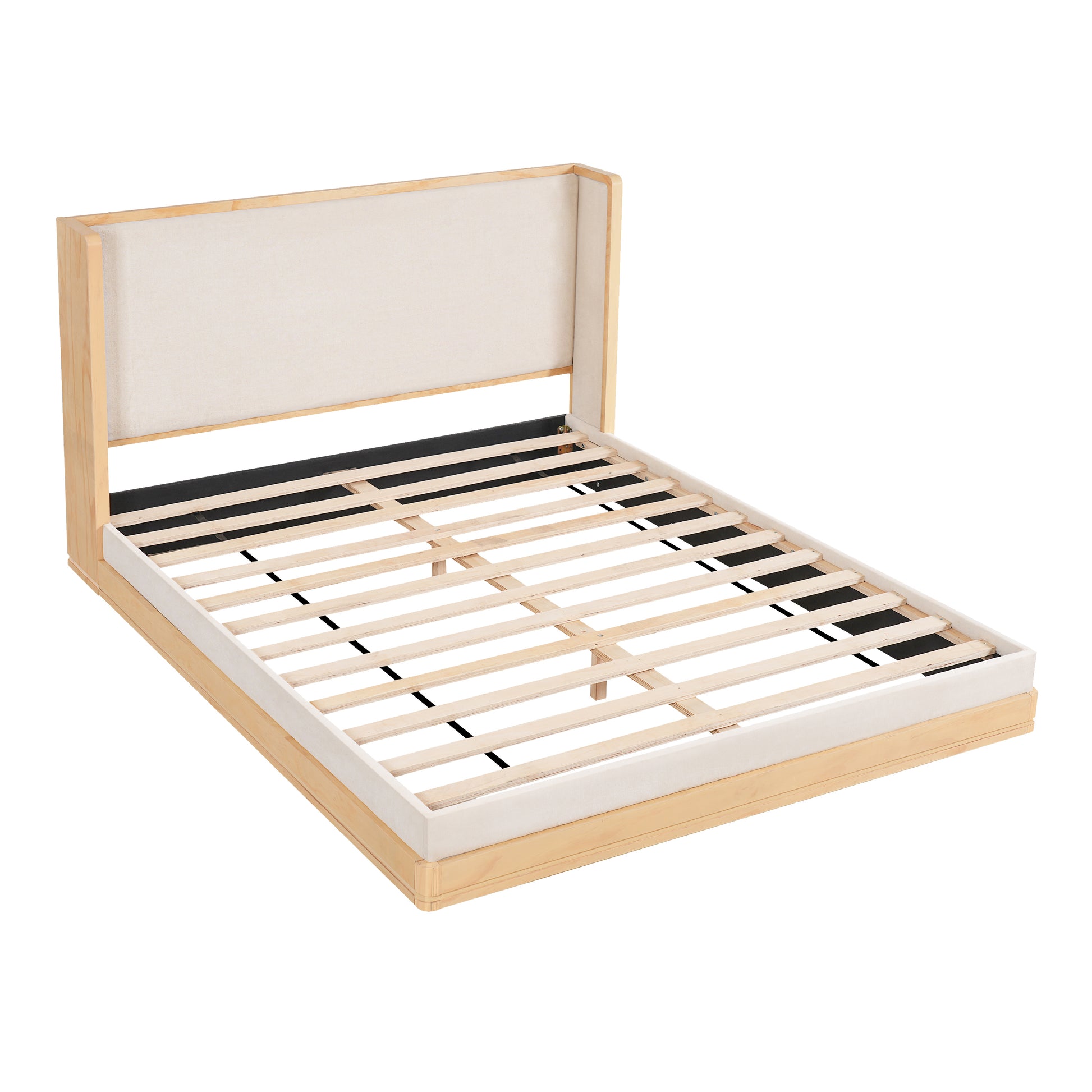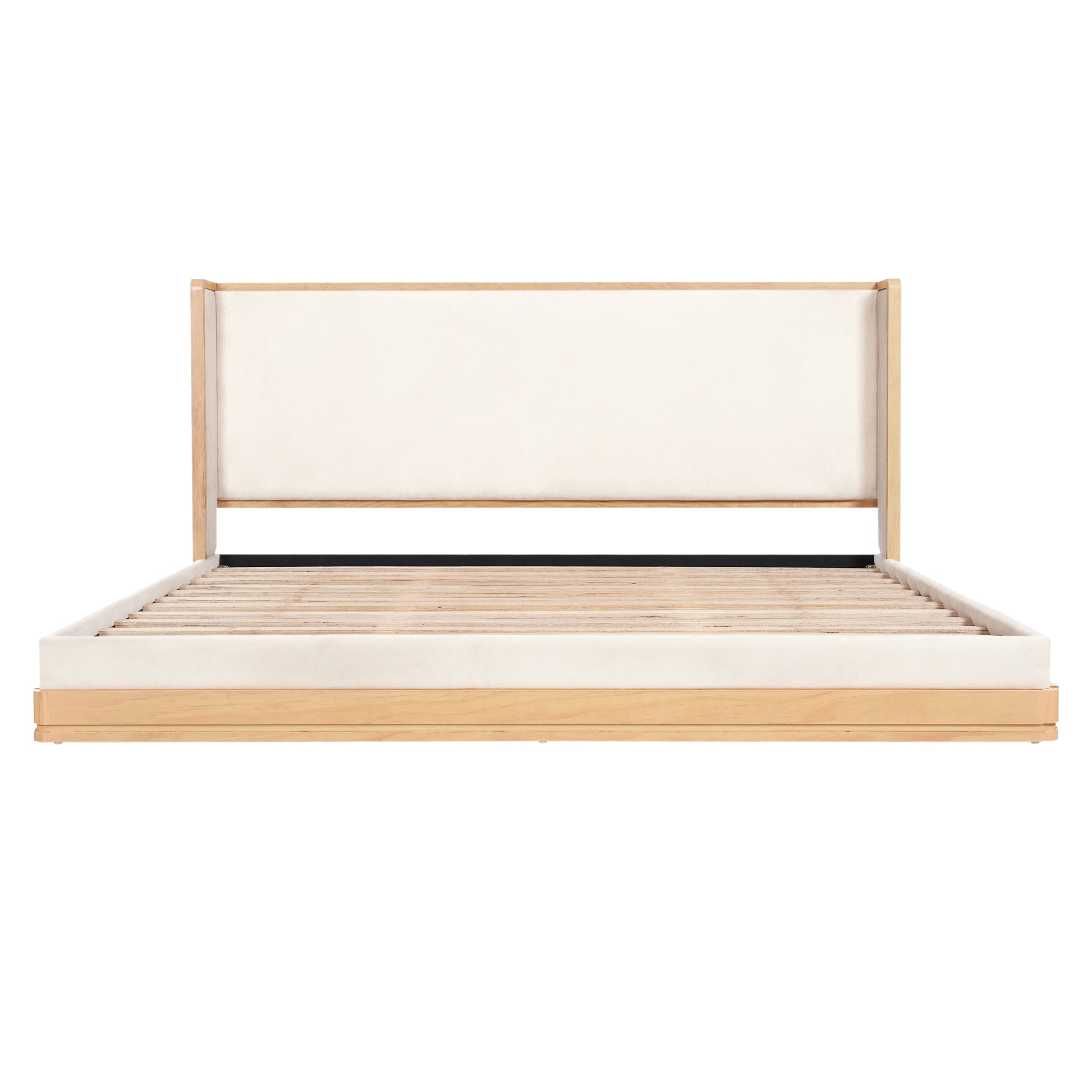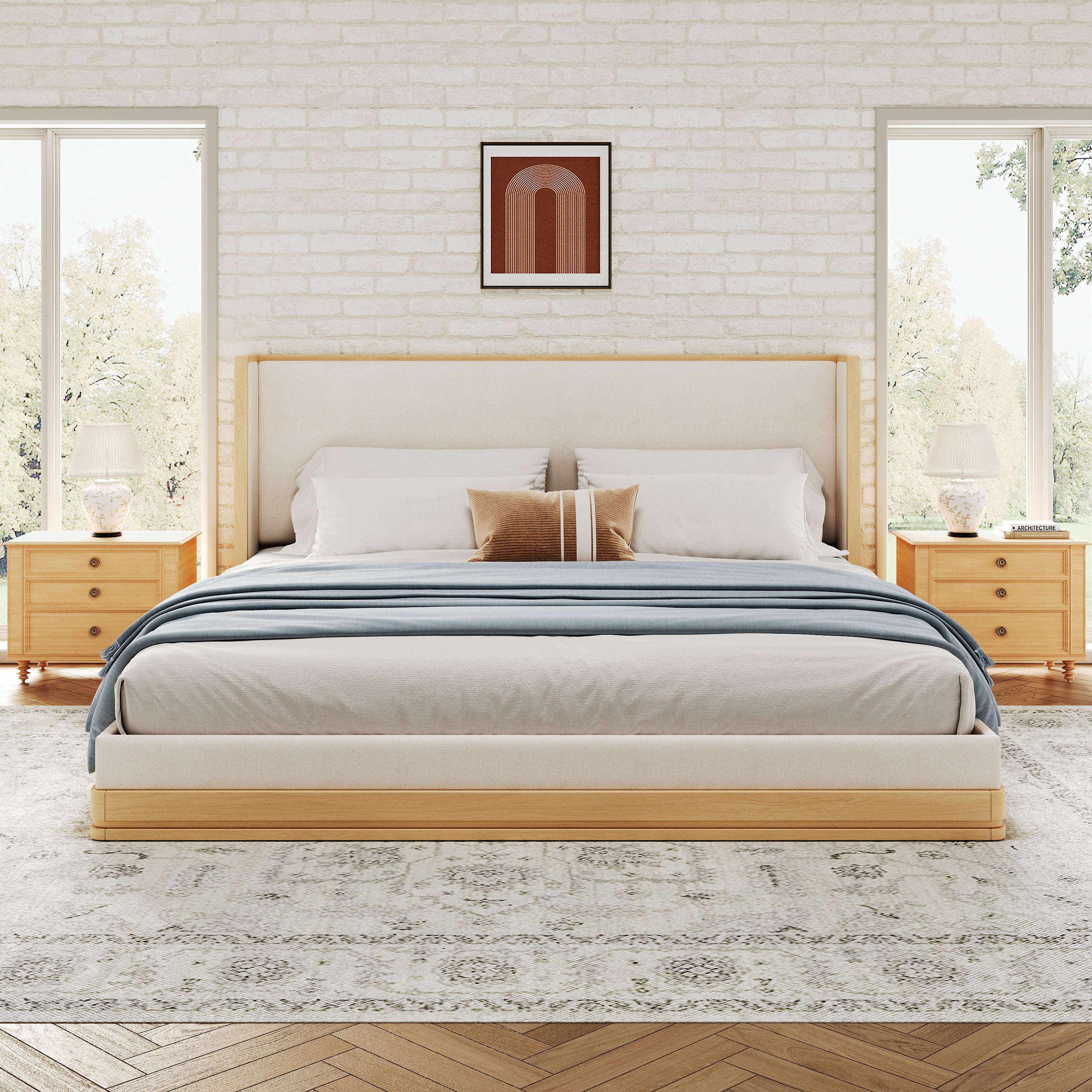 Wyndham Mid-Century Modern Wood Platform Bed – Warm Natural Frame with Beige Upholstered Headboard for Timeless Sophisticated Bedroom Retreat