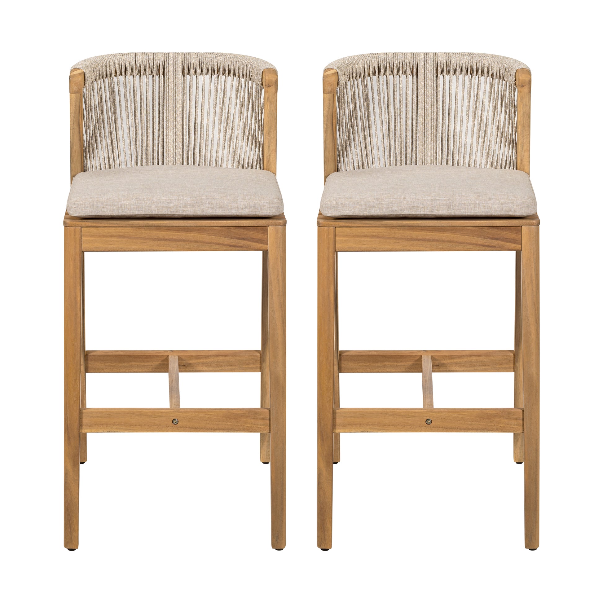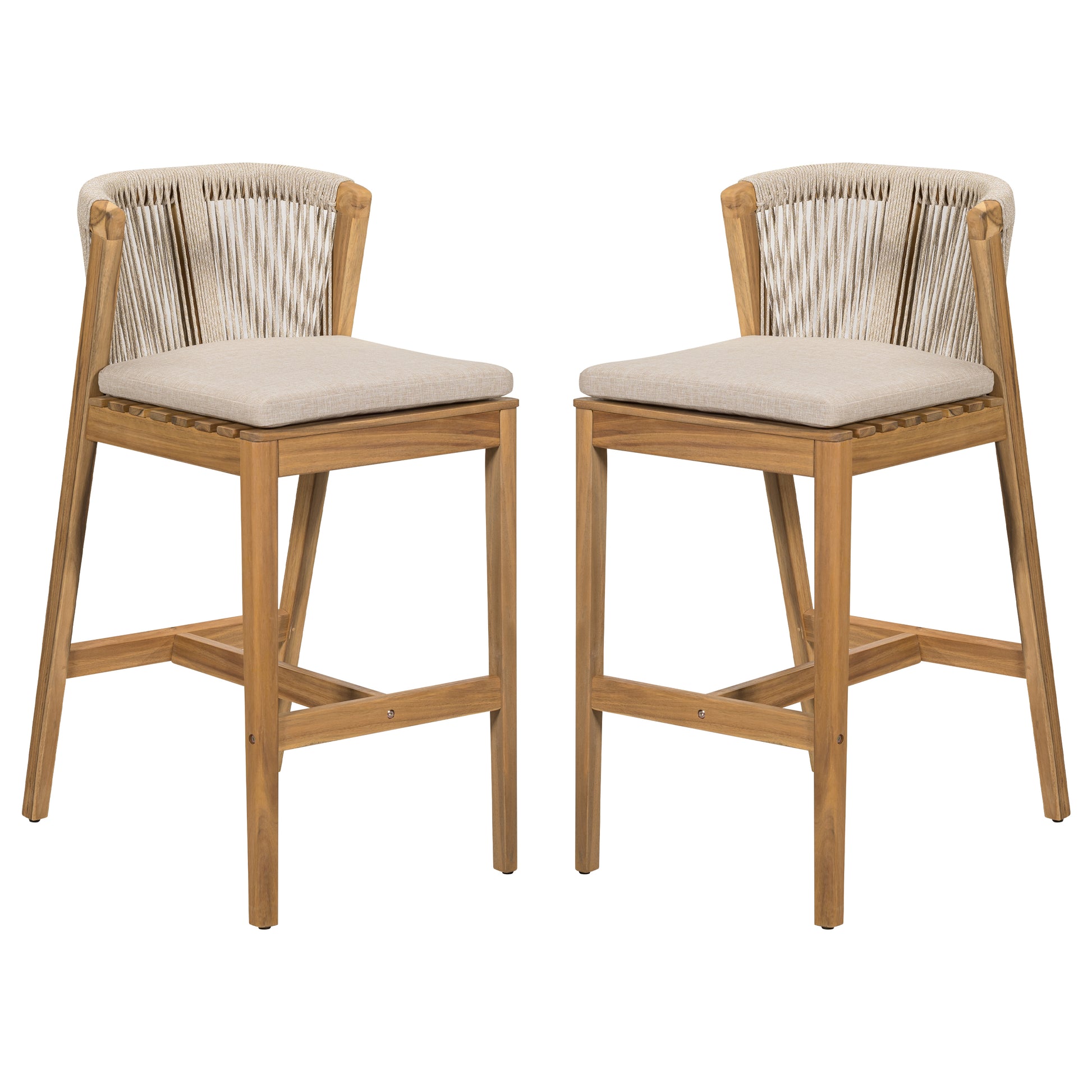 Ylisora Outdoor Barstool, Teak Finished Wood with Beige Cushion, Set of 2